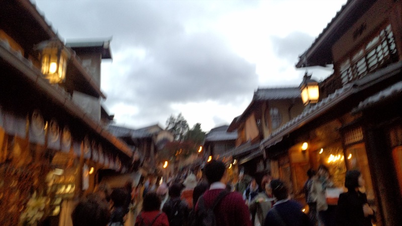 高台寺から二年坂を経て三年坂へ。行く人と来る人ともに、清水寺から、とか、清水寺へ、という関係。若い外国人旅行者が、ここではただの恋人という風情になっているのもすごいと感じます。浅草の雷門前で見る外国人とはずいぶんと「馴染み度」がちがいます。彼らには「京都の夜」なんていう思い出がズ〜ッと残るのでしょうか。
