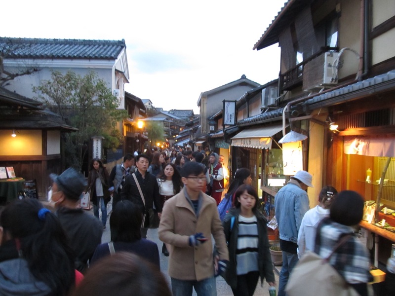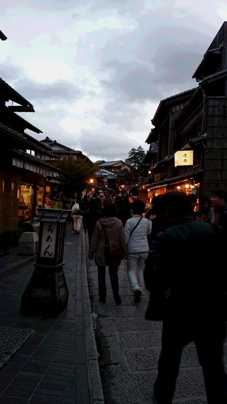 今日最後の清水寺への道。一日歩いて、歩いて、ここですいたお腹を満たす事ができるか?