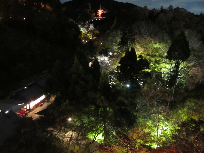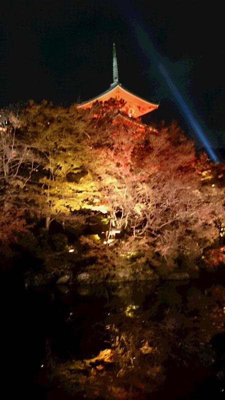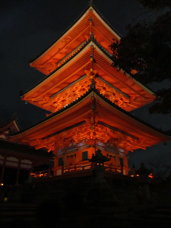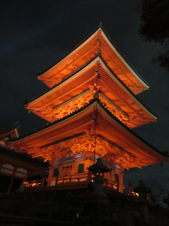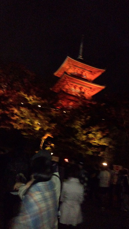 ライトアップされた清水寺の三重塔。朱色の塔は 昼間みるより 印象的だった。ここまで見られるなんて 流石 弾丸ツアー。