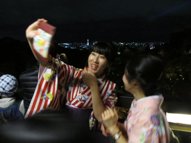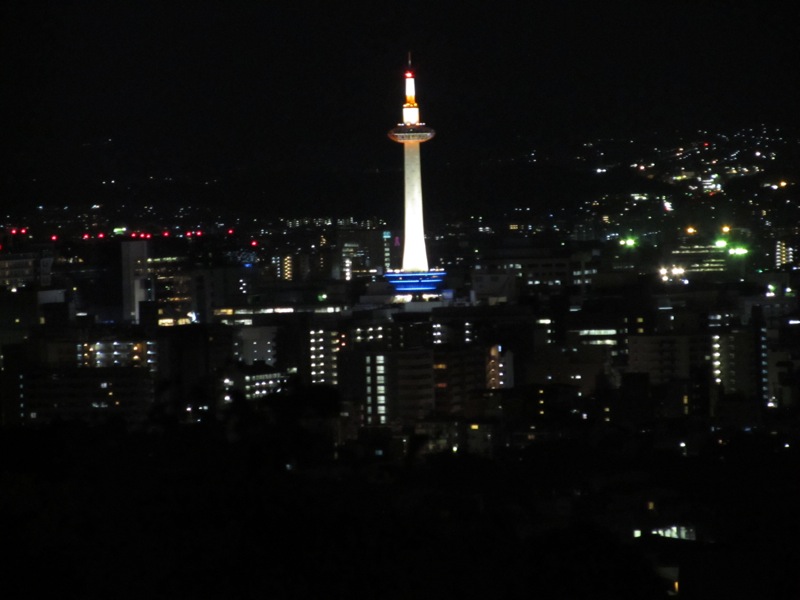 奥の院から清水の舞台を見ています。まあ有名な構図です。屋根の上に見えているブルーの線は、どういう意味があるのかわかりませんが、清水寺が京都を支配していると主張しているかのようなレーザー光線(正確に言えばたぶんサーチライト)です。市街地に見えるボーリングピンのような白い塔は京都駅前の京都タワー。