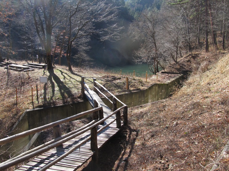 「たまらずの池」を過ぎると小さな木橋がかかっていいるのでそれを渡ると、登山道の標識があります。2万5000分の1地形図では標高1,025mの水準点に向かう一気登りの道があります。