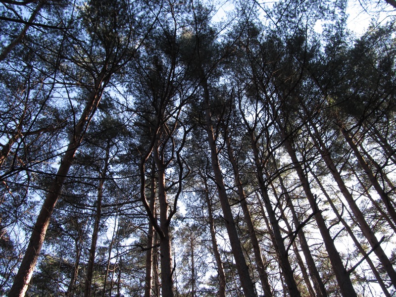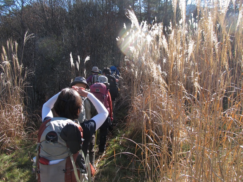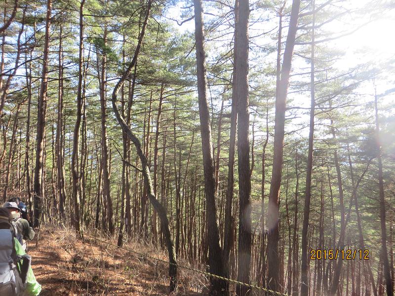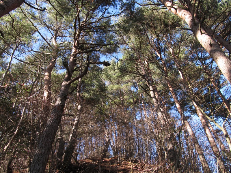 小野へと下る道はすぐにアカマツ林になります。留山ということで、かなり長い間、登山道の両側にロープが張られていました。もちろんマツタケの無断採取を禁じるため、地元の財産区がガードをかためているようでした。南アルプスの伊那側では本気でマツタケ山を育てている人もいますから、このあたりにもそういう体質が広がっているのかと思います。
