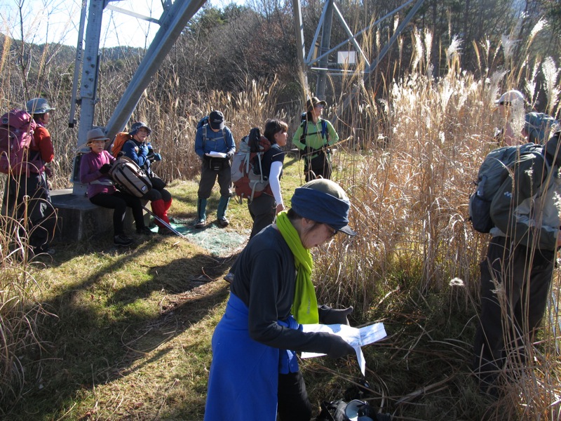 この高圧送電鉄塔が地形図の標高1,025m地点です。低山では地形図の高圧送電線の情報がものすごく頼りになります。電力会社が非協力的だとかでデータ更新があやしいと感じることも多いですけれど。昔、東京電力関係の冊子をダイヤモンド社の小さなチームで作っていたことがありますが「送電線ハイク」を提案したら即座に否定されました。「過激派組織に狙われるかもしれないから」という理由でした。隠せるほどの情報でもないと思う一方、私たちにはありがたい存在なのですが。