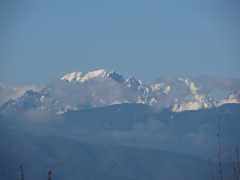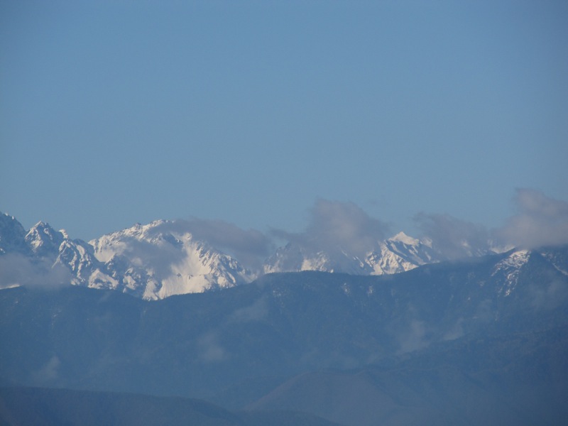 さてこれは穂高連峰です。重なり具合が複雑でよくわからないところがありますが、一番高く見えるとことが北穂高岳で、その向こうにロバの耳とかジャンダルムなど西穂高岳に下っていく稜線があります。奥穂高岳の手前には前穂高岳や明神岳があるのですが、どれがどれだかよくわかりません。右隣という感じの白い山(雲がかかっています)が北穂高岳のようですから、そこからガクンと落ちたところが大キレット……でいいのだと思います。