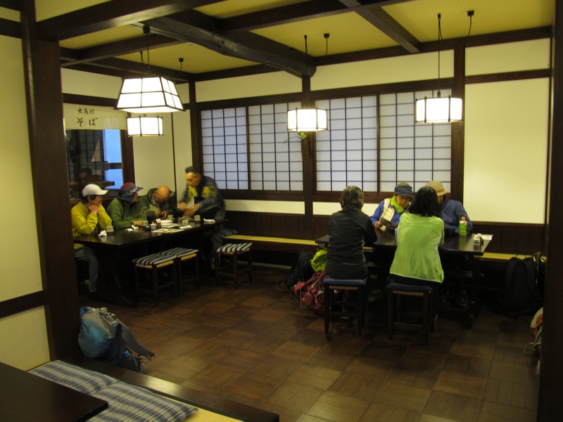 松本始発の千葉行きの特急あずさに乗りたい人が多いため、時間をかせぐために塩尻駅から松本の女鳥羽そばまでタクシー3台を走らせたのです。すると土日の夕方は松本市内は恐ろしい渋滞とかで、高いタクシー料金で時間を買うことはできず、この写真の左側の人は慌ててそばを食べ、右側の人はかろうじてコーヒーを飲んで次の特急で帰るということになりました。