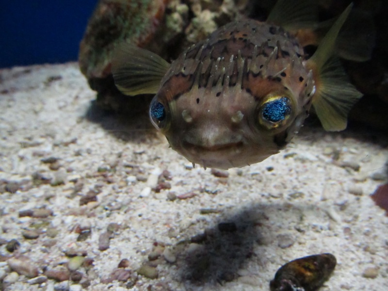 これはハリセンボン。針は「350本ぐらい」だそうですが、とにかく目がすごい。2枚撮って2枚とも目が光っていたけれど、外の光景が写っていたのかも。これも生息水域5〜40mなので深海魚とはいえないので残念。