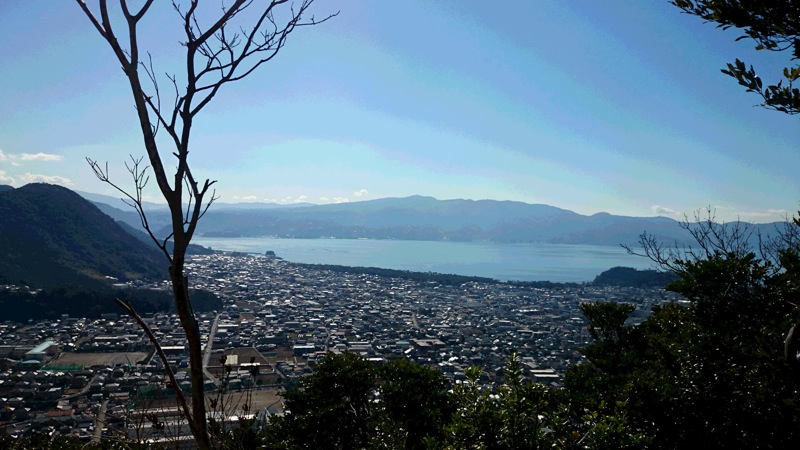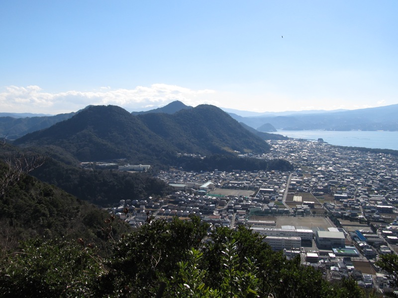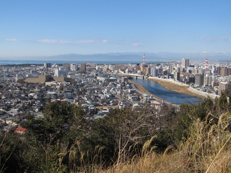 沼津アルプスへは7回来ているけれど香貫山に登ったのは初めて。これは山頂手前の香稜台(五重塔があります)から見た狩野川(最後左に大きく曲がって沼津港に向かいます)。右奥に白い山が見えています。