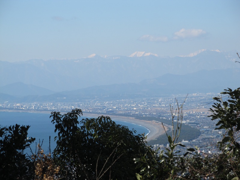 徳倉山(256m)の山頂に立つと、千本松原が広がってきました。そしてその向こうに立ち上がってきた白い山は南アルプス南部の(左から)聖岳、赤石岳、荒川岳。
