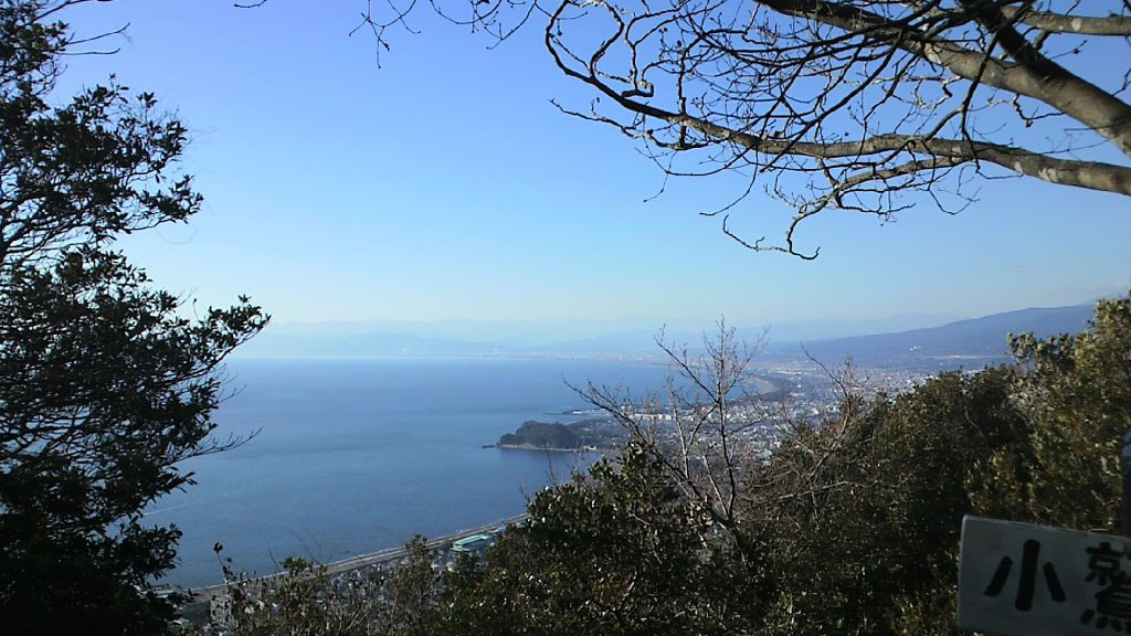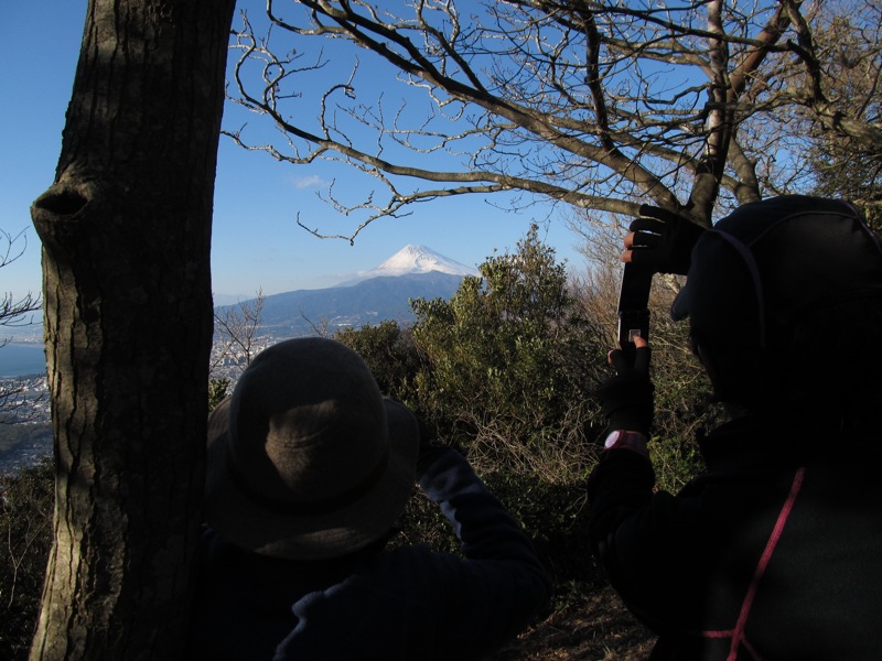 林の隙間から富士山が見えました。この日の静岡での日没は17時08分でしたから太陽はすでに相当低く、相模湾の沖合に見えていたはずです。じつはこの日の計画では、このあともうひとつ、雪の富士山を見る計画があったので、残り1時間を逆算して、行動を組立て直す必要がありました。