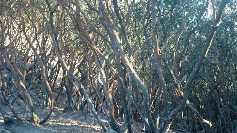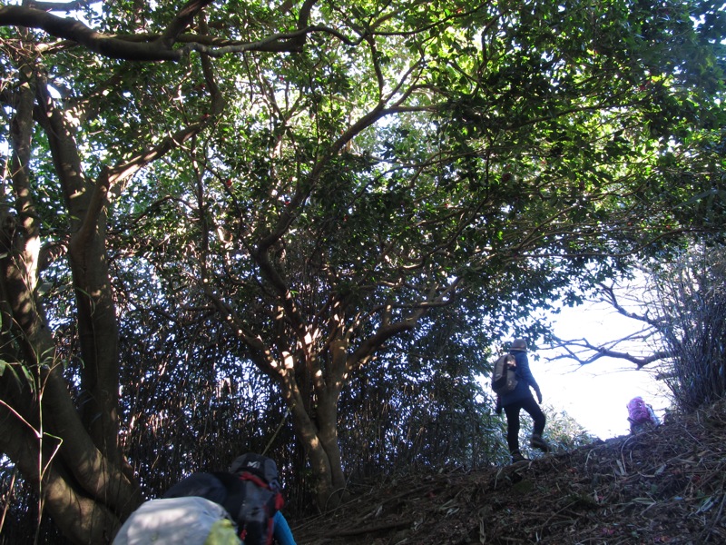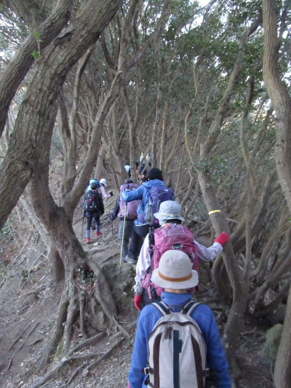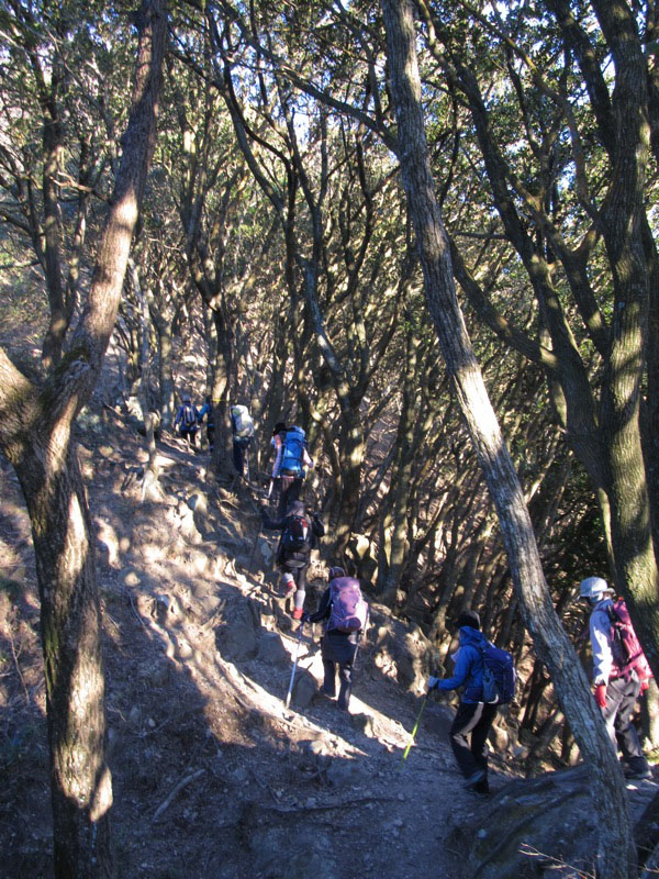 いよいよ沼津アルプスのハイライトのひとつウバメガシの稜線です。「海岸付近の乾燥した斜面に群落をつくる」という典型的な光景がここにあります。しかも純林をなしているという点では、これが北限とのことです。