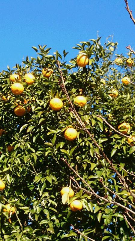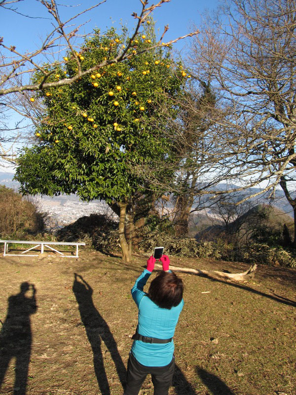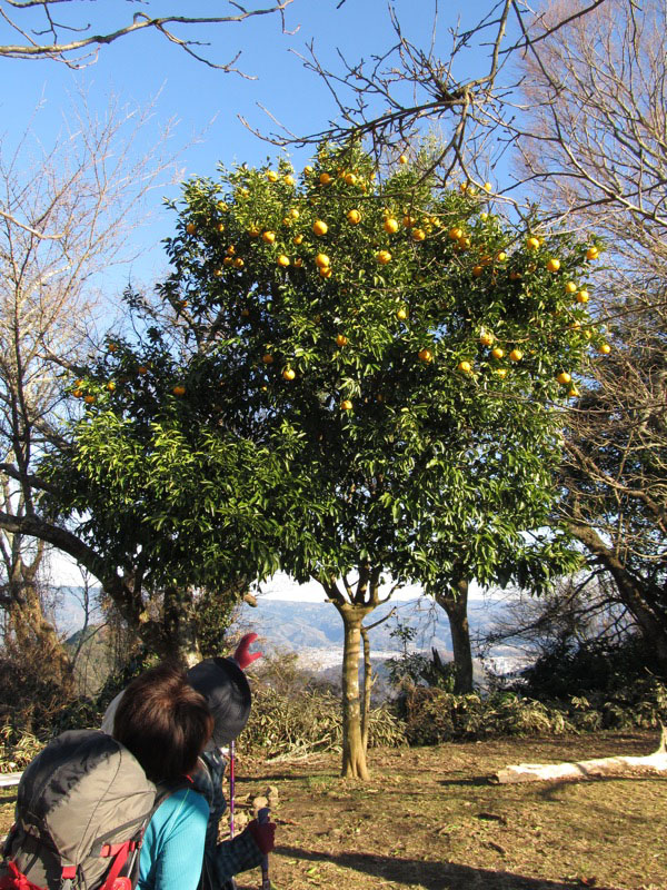 鷲頭山の山頂には立派な夏みかん……でしょうか。登山者がなんとか届きそうな場所より上にみごとな実がついていました。