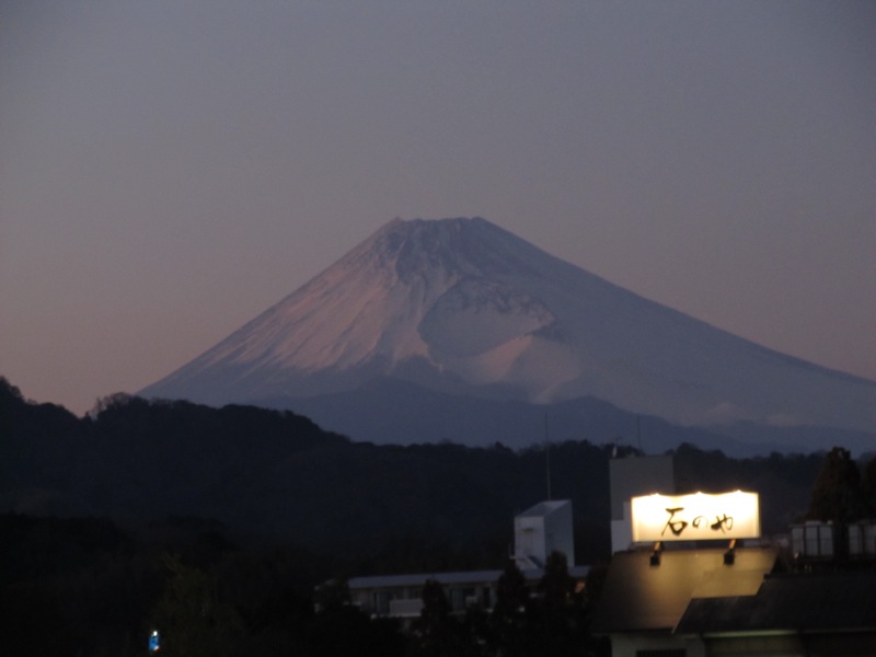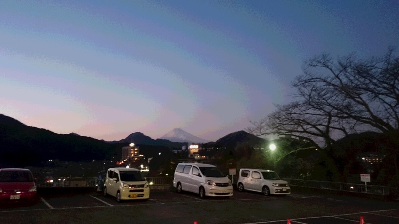 17時33分に伊豆長岡温泉のニュー八景園に到着しました。その玄関先から、富士山が最後の光で見えました。露天風呂に入ったときには残念ながら完全に夜の帳が下りてしまっていましたが。