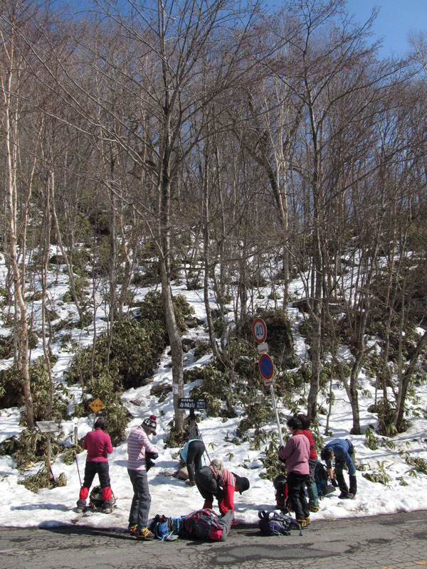 バスの終点が赤城公園ビジターセンター。そこで身支度を調えて、何軒かの食堂がかたまっている大洞から湖岸を進んで赤城神社の先、黒檜山の登山口に着きました。ここでアイゼンをつけました。