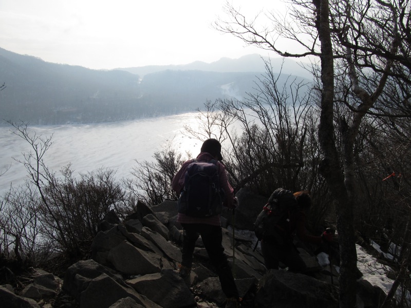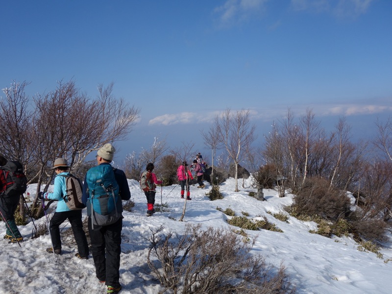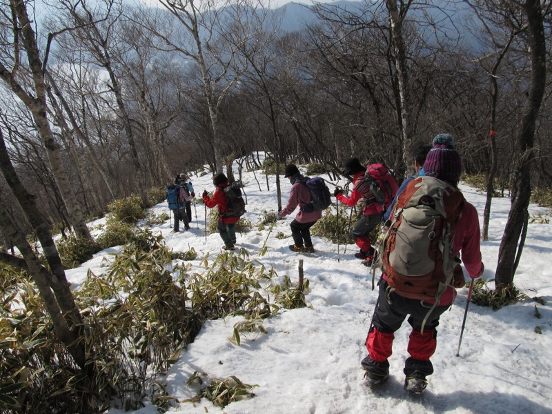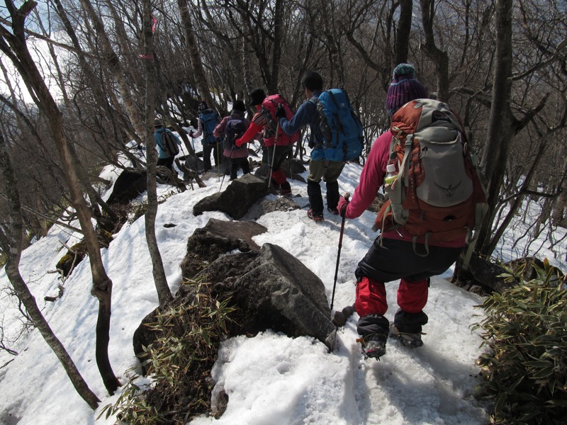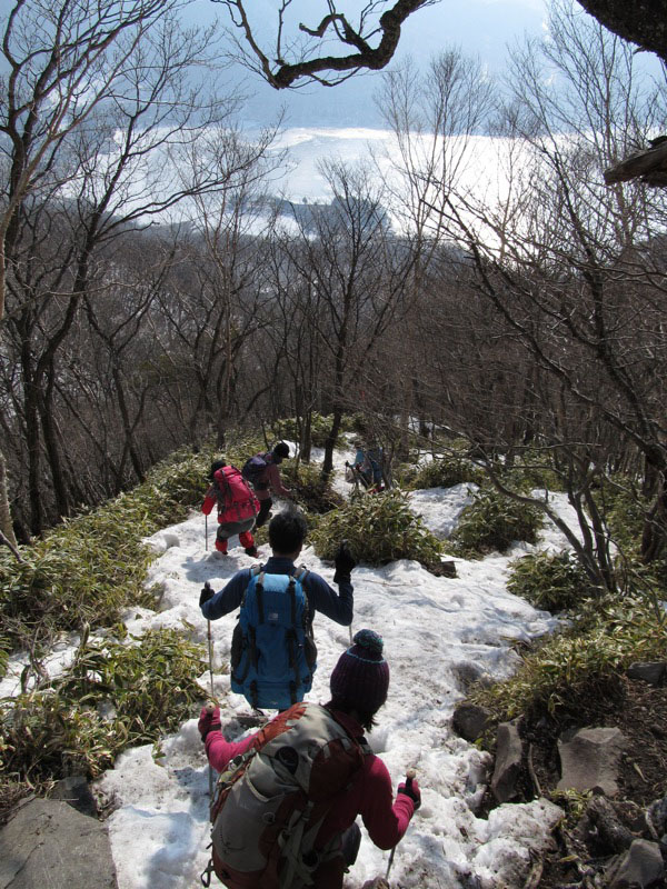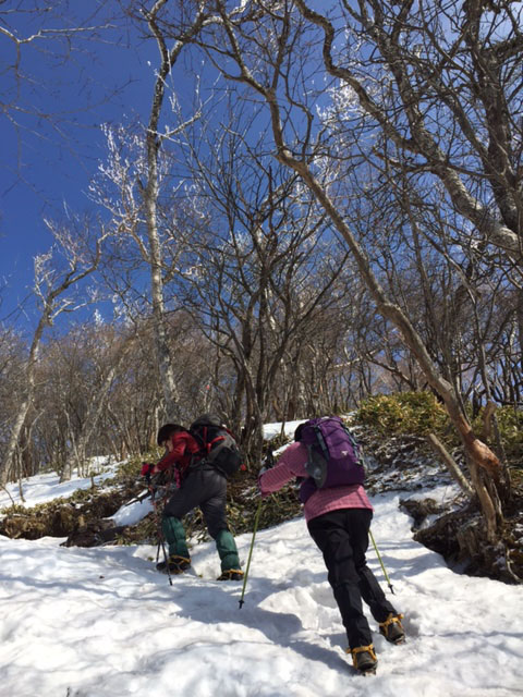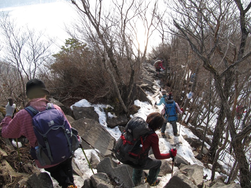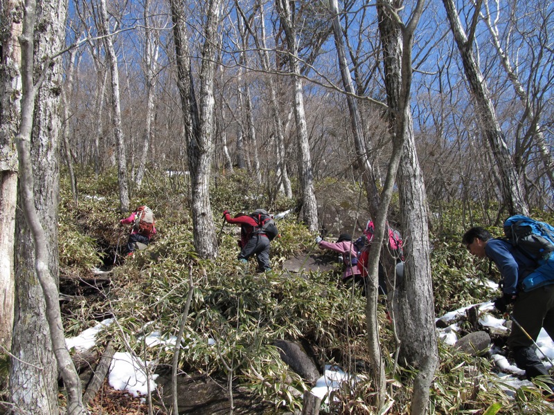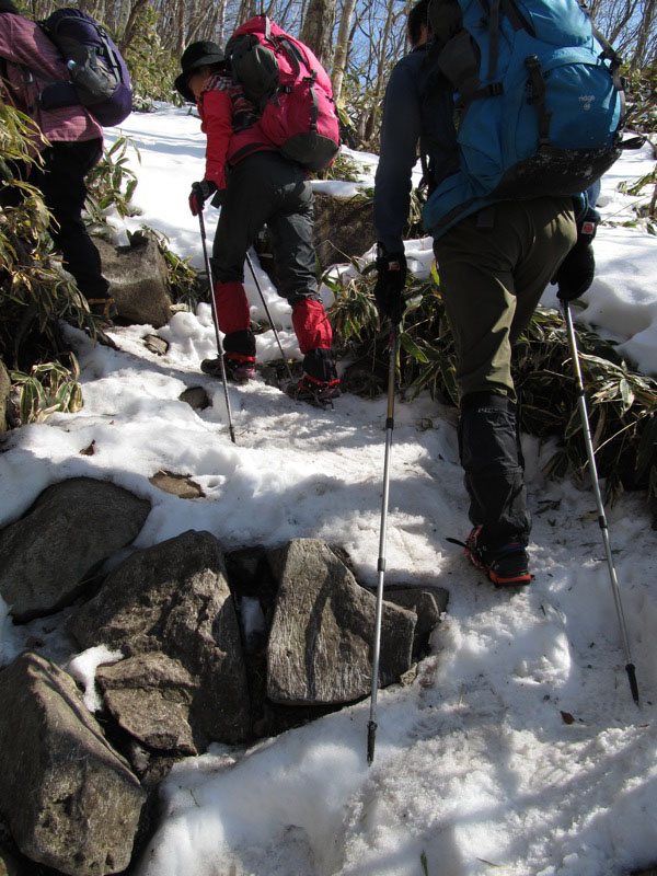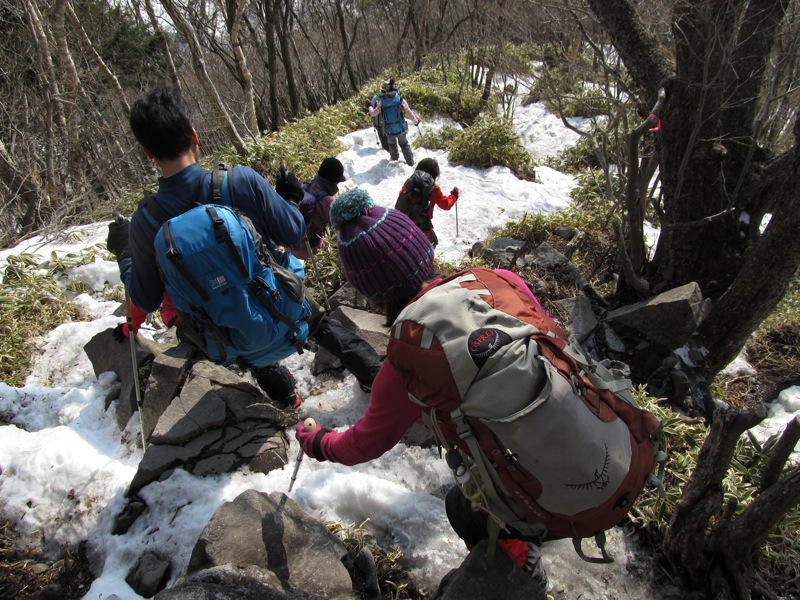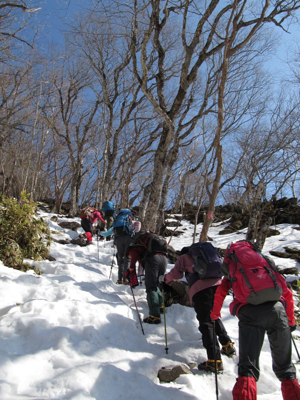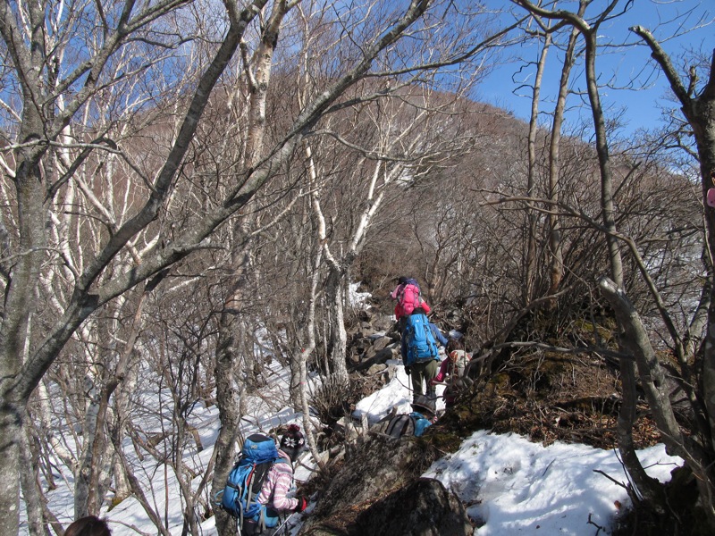急登が続いて。足下は冬なのに日差しは春本番で汗ばむほど。