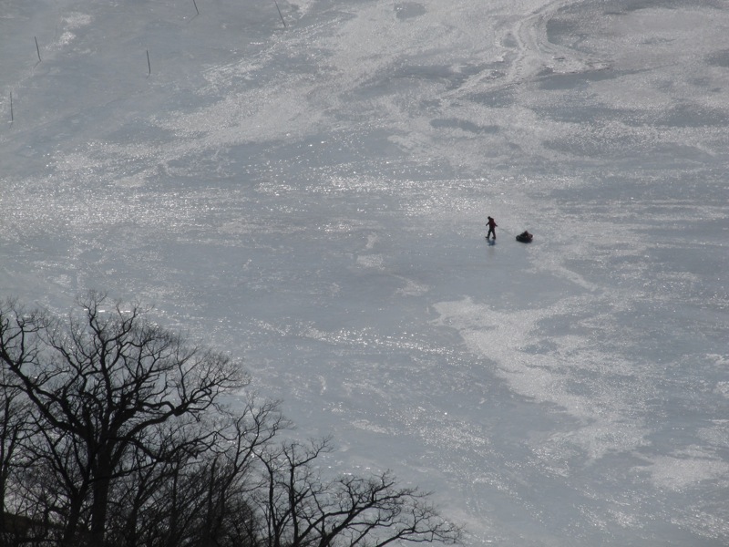 この人は湖の中央部にテントを広げて、ワカサギを釣っていたのです。釣れたかどうかは人によって驚くほど違うのですが、ともかく今日はここまでと道具をしまって、赤城神社の駐車場に向かって一直線に歩いています。その一直線の感じから、この人は岸近くの氷の厚さに不安をもっていないかどうか、私は断続的に観察を続けました。画面左上に竹竿が見えますが、赤城神社の周辺に危険な状態があったから立てられたのでしょう。そこが今、この人にとって危険な場所なのかどうか、分かればうれしいという気持ちではありました。