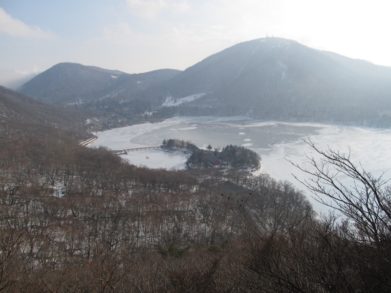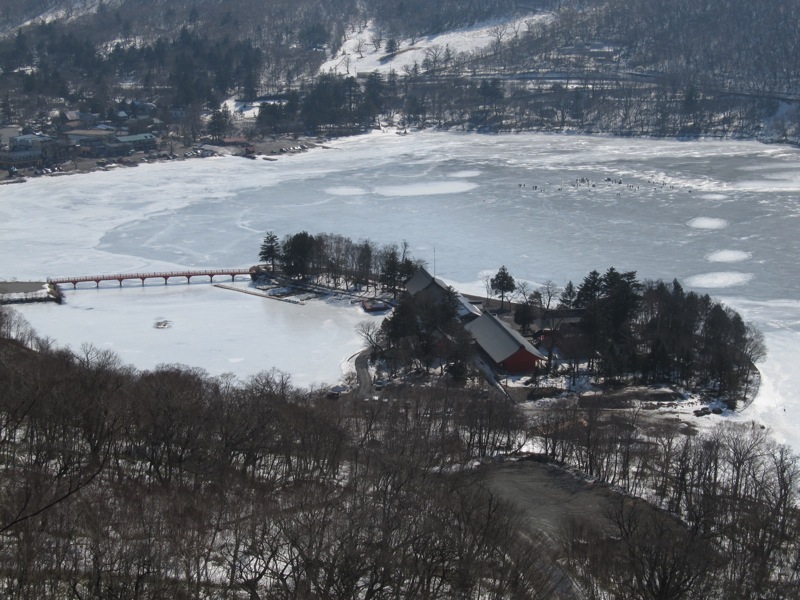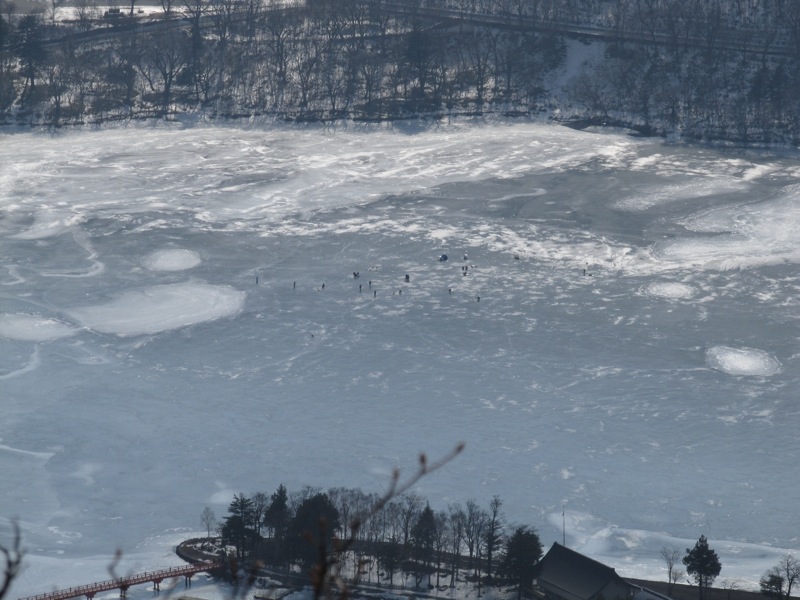 この広がりの中で、赤城神社の右手、氷の中央に、釣り人の姿がかろうじて見えています。湖面中央の大きな集団は写真のもっと右側になります。