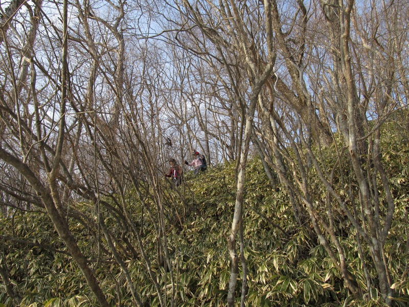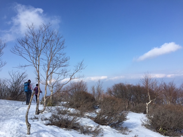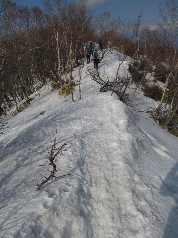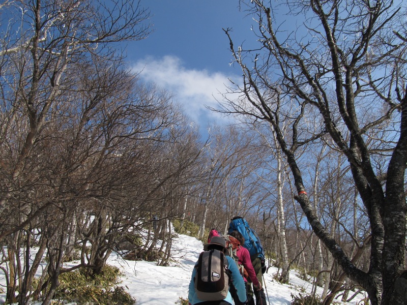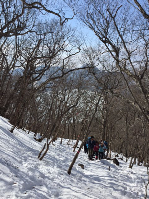 気持ちのいい急登が続きます。この急斜面が、この赤城山では雪遊びに最高なのです。安全第一でも下れますが、テレマークポジションで滑降することもできますし、尻制動もできるのです。が、かつてそれに失敗して尾てい骨を傷めた人が恨みを晴らしたいといって、今回参加していました。今日はここまで来ても風の心配をしないでいます。無風快晴という気持ちのいい日です。雪さえ通年どおりにあれば最高の日よりでしたが。