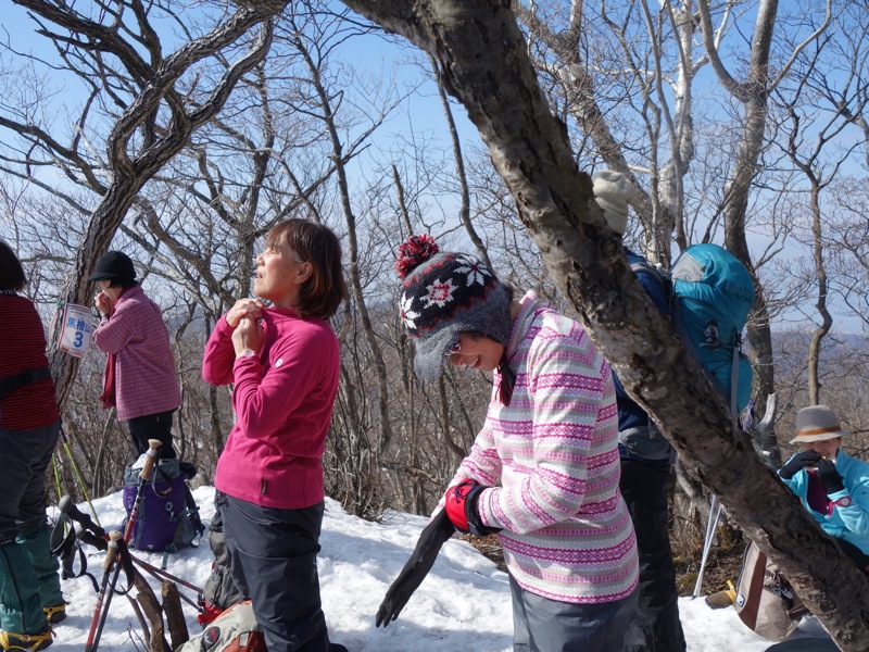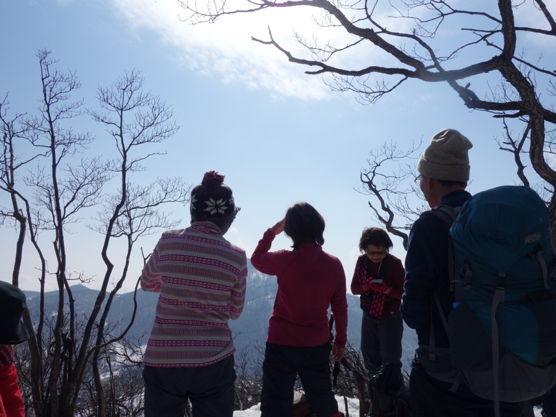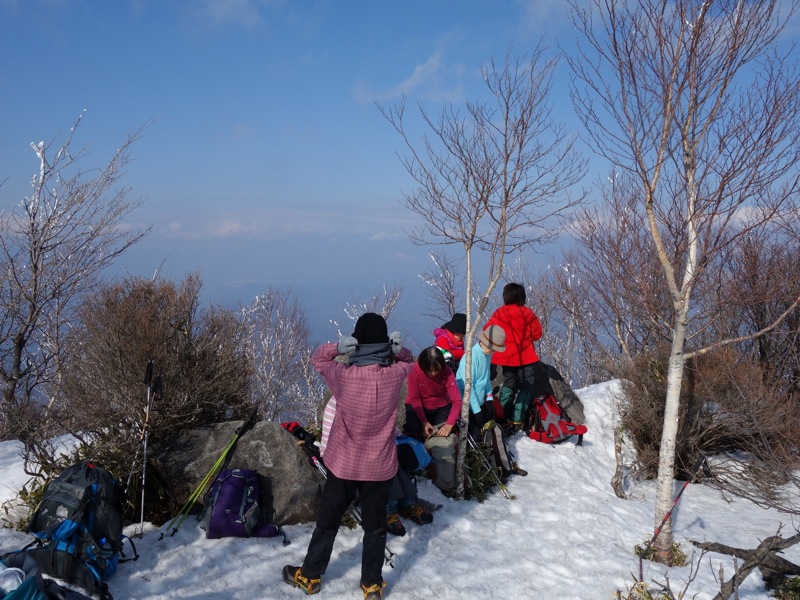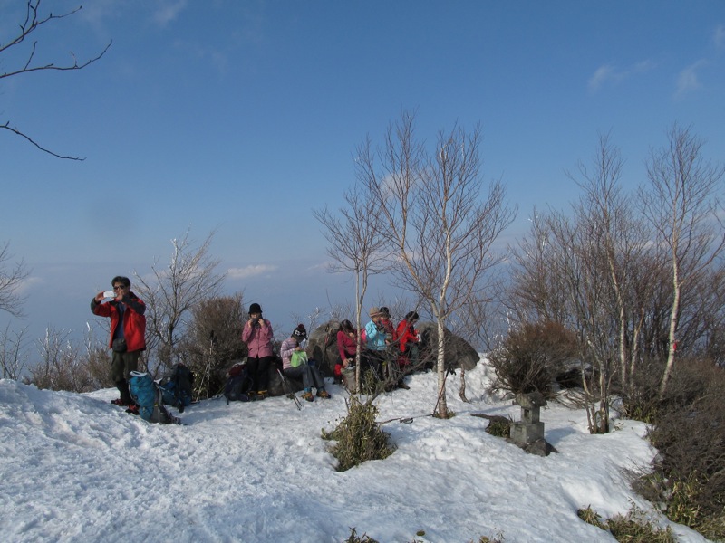 山頂をとりあえず素通りして、展望台でランチです。風がないので景色のいいところでゆっくりできます。向こうに谷川岳があるのですが、雪雲におおわれてはっきりしません。あちらは雪国ですから、こちらが晴れているときには雪が降っていておかしくないのです。