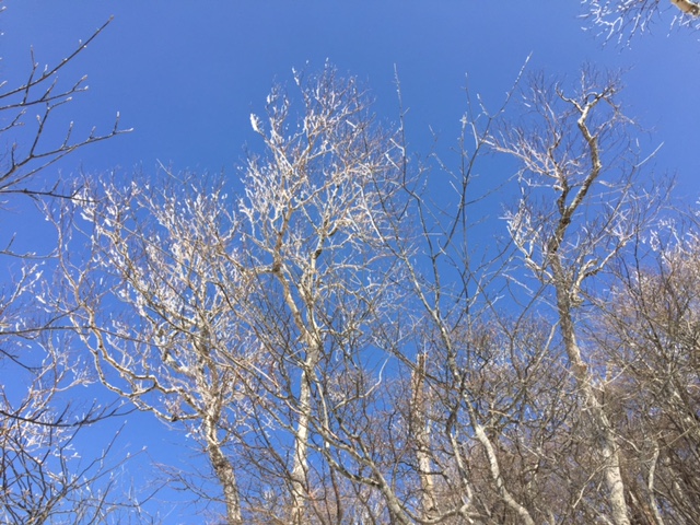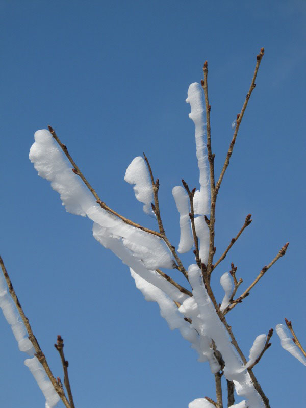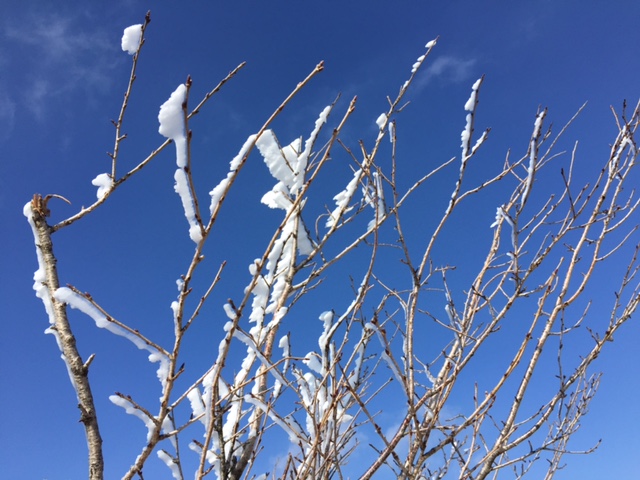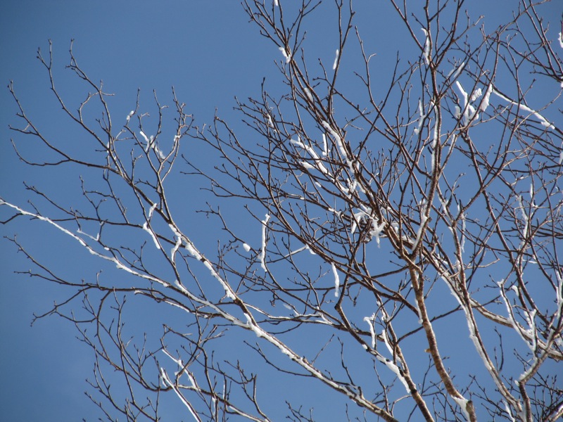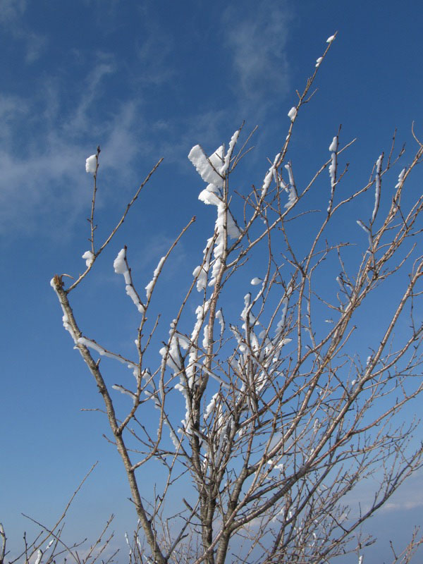 霧氷は風上に延びていきます。その最初の部分、裸の枝にぶつかって、その衝撃で瞬間的に氷になったところが透明感のある氷になっています。太陽に照らされると、全体がゆるんでくるのでしょうか、枝先のひとかたまりの氷片がドサンと落ちます。