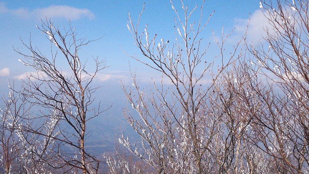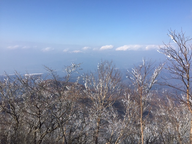 山頂稜線の霧氷は谷川岳など上越の山々を越えてきた過冷却の霧が流れたことを記録していました。登る途中で見たのは逆方向にのびていましたから、そこでは風がまわりこんでいたのかとも思います。