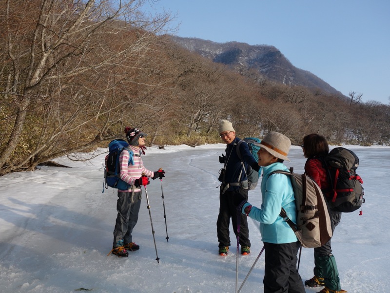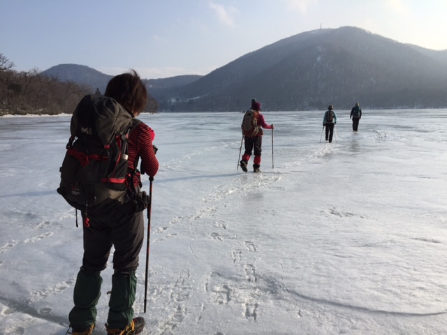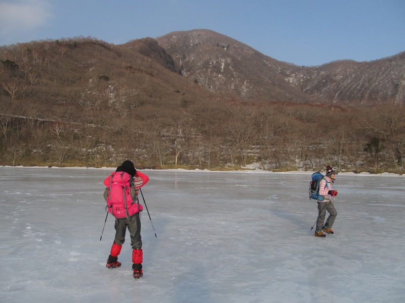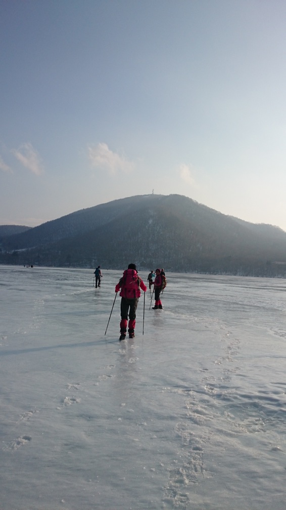 登山口まで下りてバス停までは大沼の周りの車道をてくてく歩くか大沼の氷の上を真っ直ぐに進むか。ほとんどの人はコーチの指示に素直に従って、不安を感じつつも直進コースを選んだ。