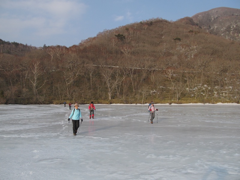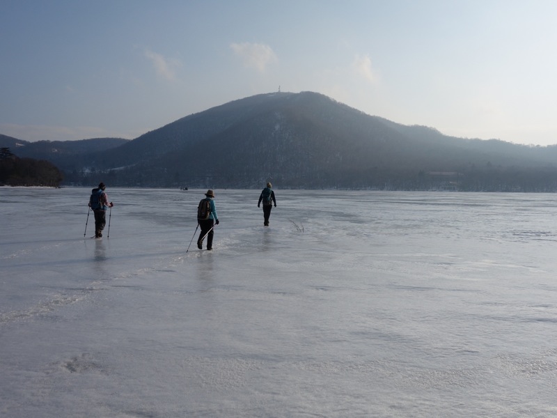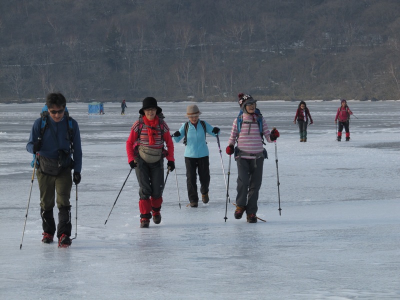 念のため、と、教育的配慮で、各人離れて歩いてもらいました。じつは湖岸から湖面に乗ったとき、いろいろ確かめてみたのですが「全面氷結」とされていた状態を自分なりに確認しました。でもやはり、湖面の氷のあやしい模様は、まだ疑いを残しています。