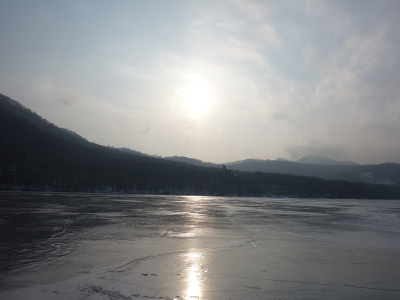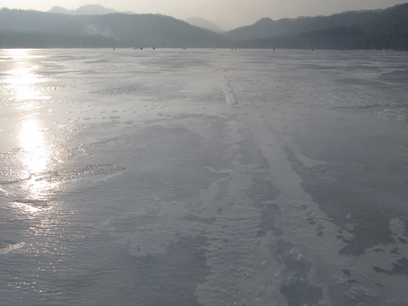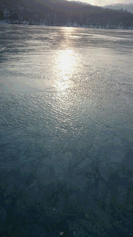 透き通った青氷の下にけっこう不穏な模様が見えています。雪が少ないということと、湖面の氷が、全面凍結とはいえ、盤石の状態かどうか、この不穏な模様がじっさいにどのようなものなのか、想像をふくらませざるを得ないのです。