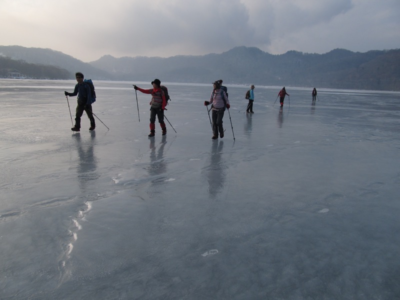 氷が割れないようになるべく広がって歩くように、というコーチの指示を皆さんどう受け止めたのでしょう。冗談に違いないと自分に言い聞かせつつ、足元の氷に緩みがないかどうか、浅いところなら割れても大丈夫と、氷を蹴飛ばしたりつついたりしてみて安全を確かめ、自分で納得しながら、足を一歩一歩進めた、というところでしょうか。