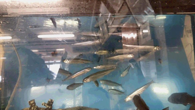 近くの 店内の、水槽のなかにはワカサギがおよいでいた。