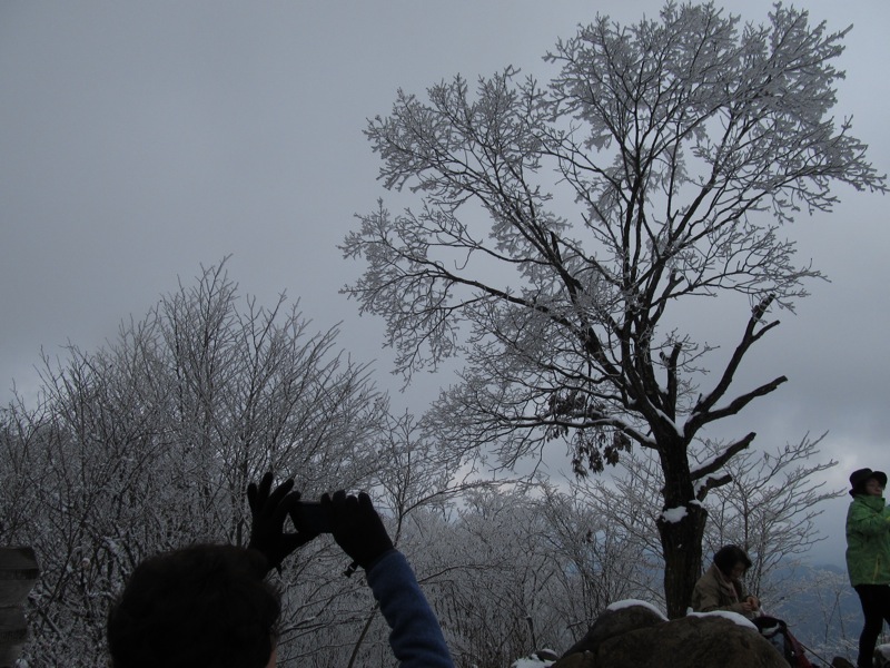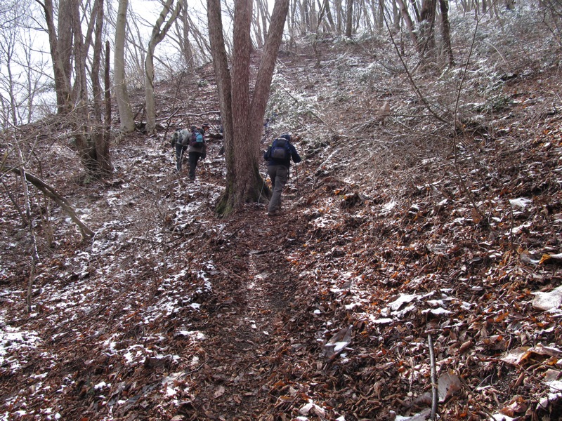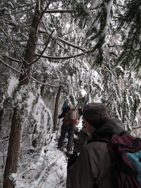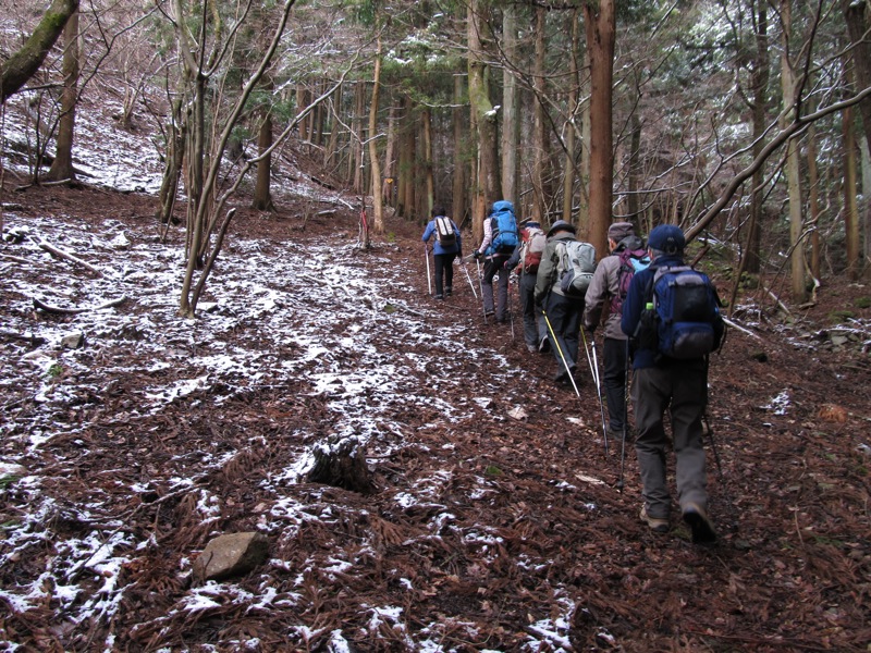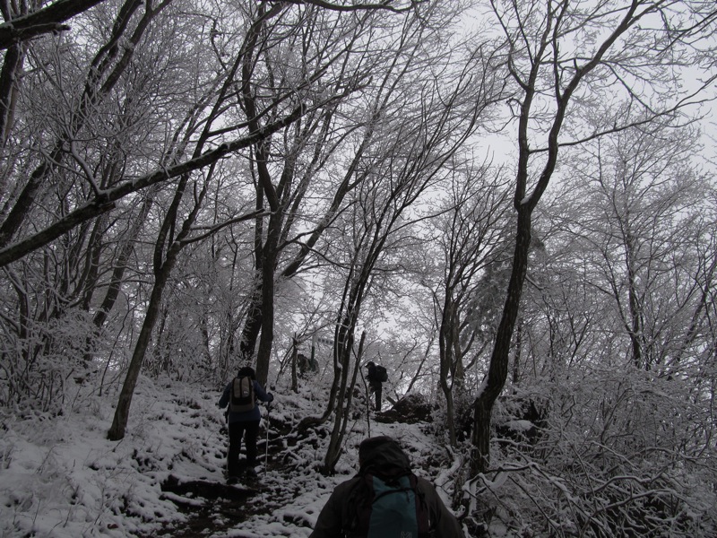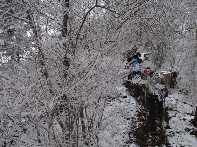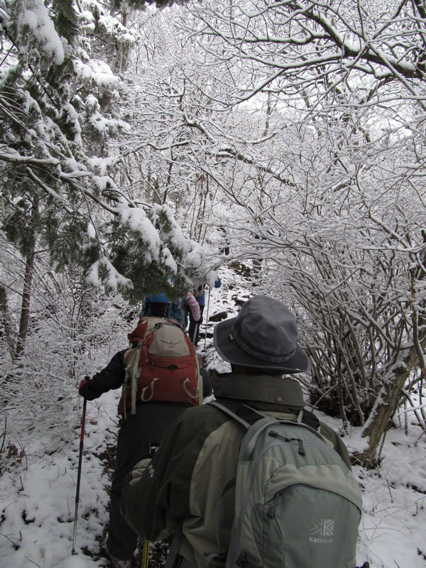 大棚から見上げると、高川山の斜面が霧氷にしては厚みのある白化粧になっていました。雪が降ったのかもしれないという感じです。あわてて軽アイゼンを持っている人、持っていない人をチェックしたら、どんな状況でもなんとかなりそうな計算が立ちました。装備状況によってはクサリ場のあるシラノサワ・コースを敬遠しなければ、と考えました。