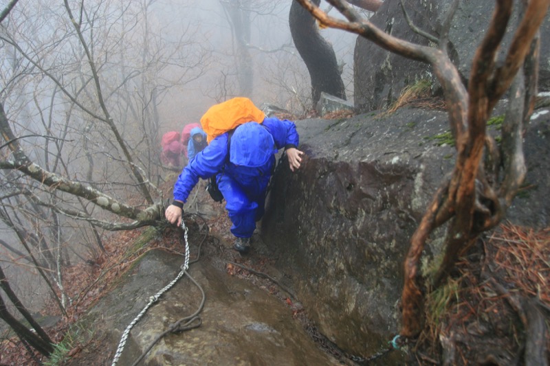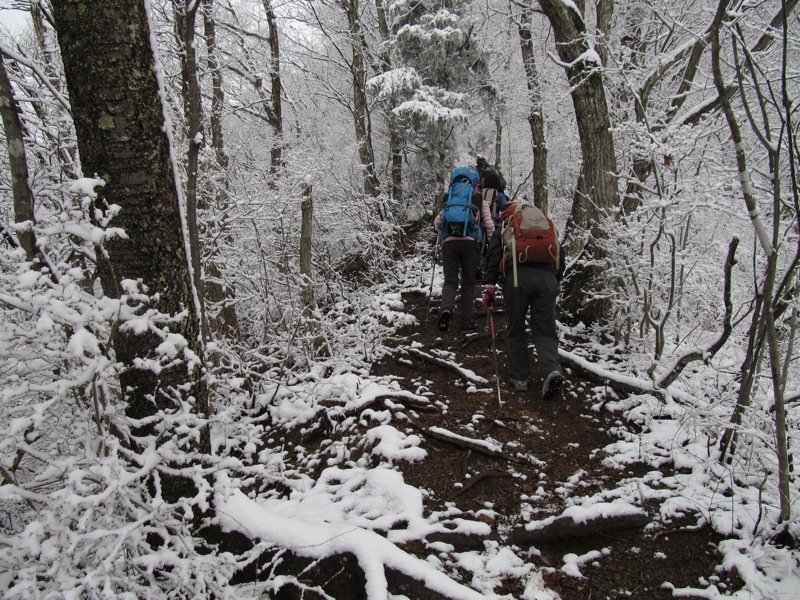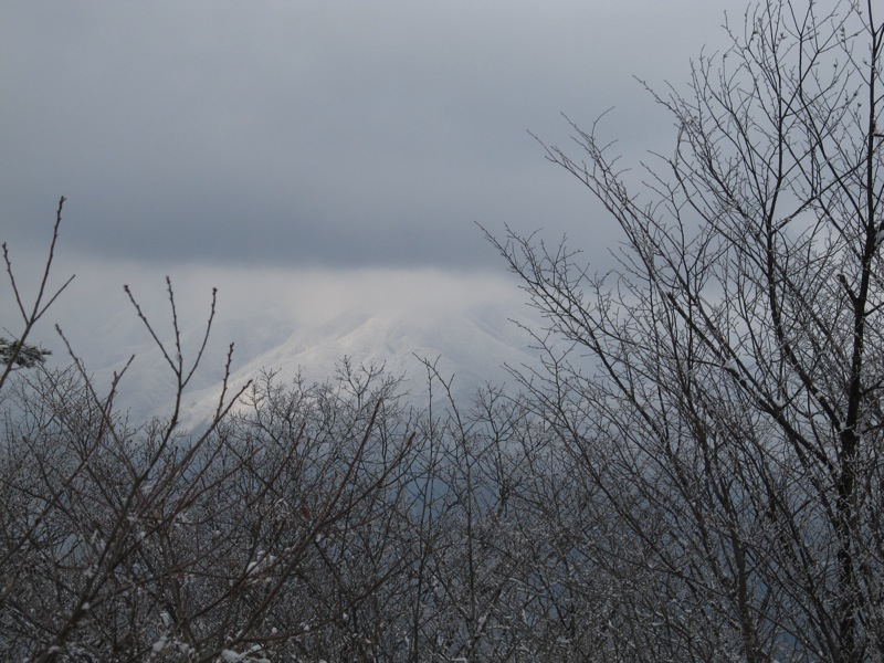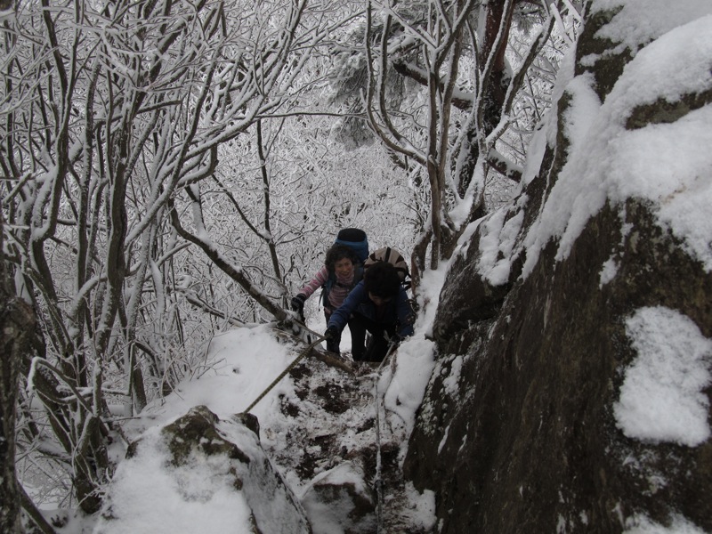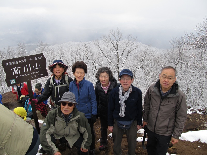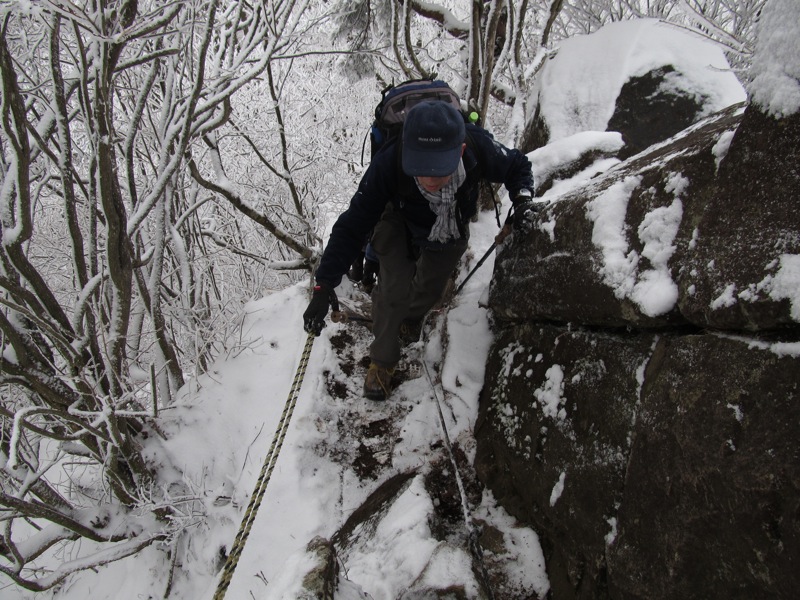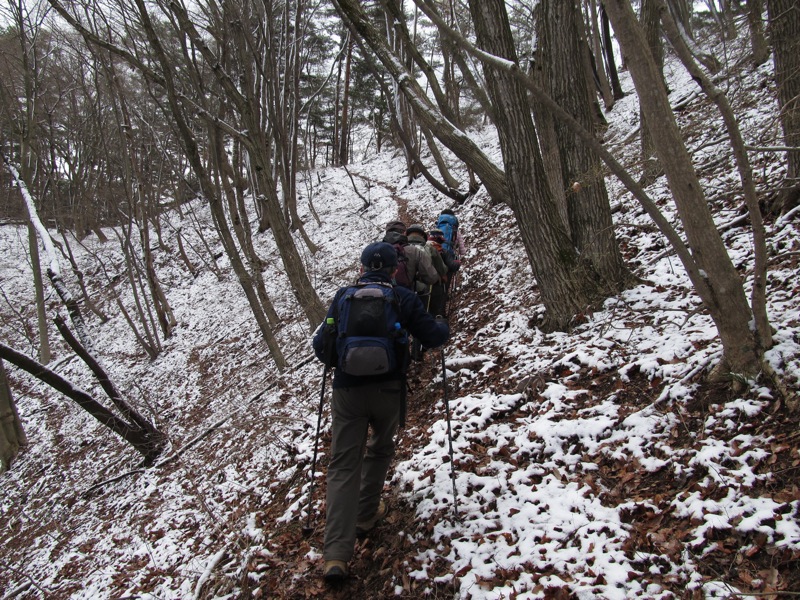 大棚から見上げると、高川山の斜面が霧氷にしては厚みのある白化粧になっていました。雪が降ったのかもしれないという感じです。あわてて軽アイゼンを持っている人、持っていない人をチェックしたら、どんな状況でもなんとかなりそうな計算が立ちました。装備状況によってはクサリ場のあるシラノサワ・コースを敬遠しなければ、と考えました。