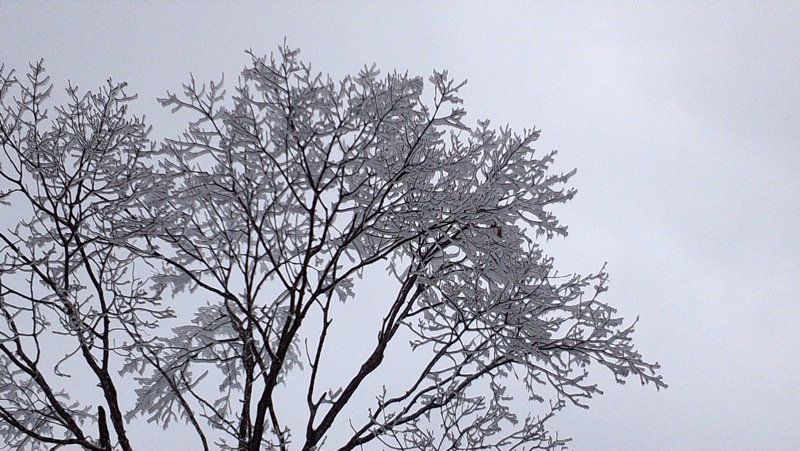 足元の雪はまだ歩くのに支障がありません。でも岩場ではどんな状態になっているでしょうか。ふと気づくと、細い木の枝に雪とは違う白い模様が浮き出てきました。