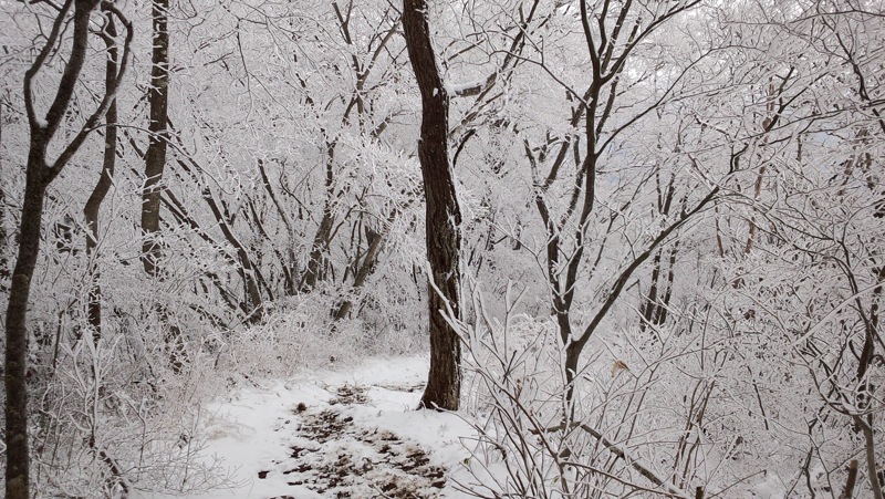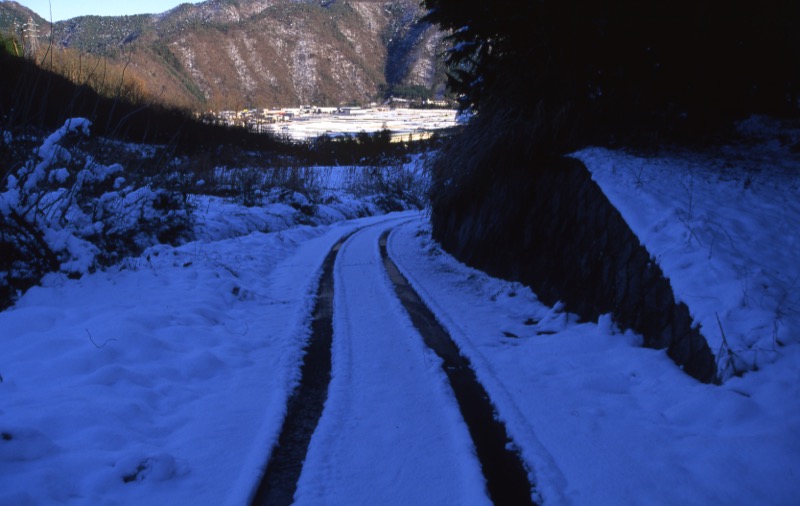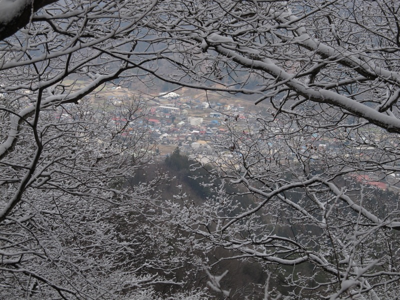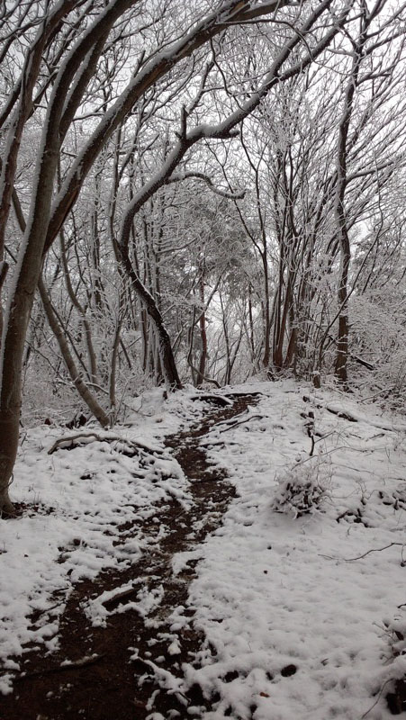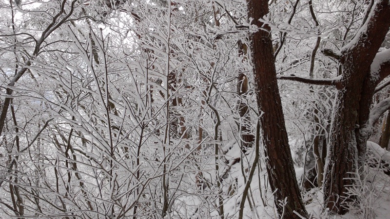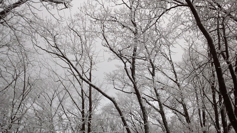 景色は雪でも、道はまだいつものまま。首都圏では年末からしばしば霧氷を見ますし、3月になると西高東低の気圧配置が崩れて大雪が降ることもあります。しかし雪と霧氷がダブルで、しかもフレッシュな状態で見られるというのはほんとうにラッキーでした。