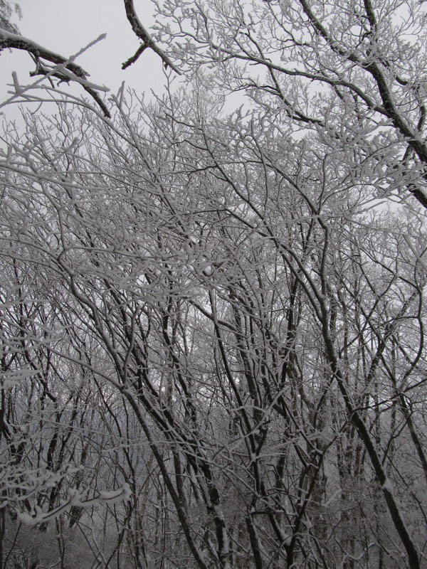 ふたたび雪に目が向きました。霧氷は風上に向かって伸びていきますが、雪は上から降り積もります。そのふたつが奇跡の合体をするのが蔵王や八甲田山の樹氷ですが、ここではそれが別々のものとして並んでいます。