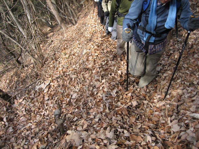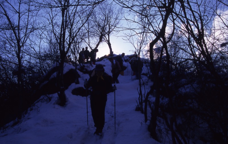 雪は山頂に向かって、しだいに深く積もっている気配です。リーダーにとってはこのあたりが一番の悩みどころです。どこかで、進退の決断を求められるかもしれない、ということを考え始めます。