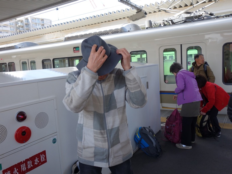 足先から帽子まで ご覧あれ。いつもの山行とは 違ったタウン風テイストのお洒落な我等がリーダー。