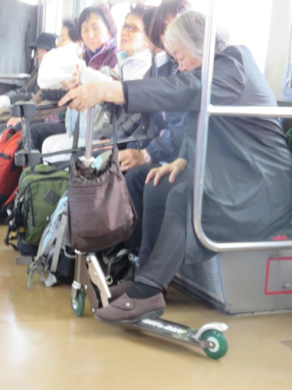 奈良へ向かう電車の中で乗り合わせた87歳の女性。左足を乗せているのは 彼女の愛車? これでスイスイと街中を走るというから驚き。実際走っている所を見てみたい。