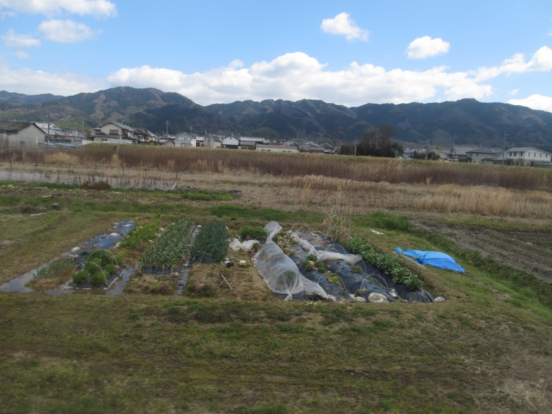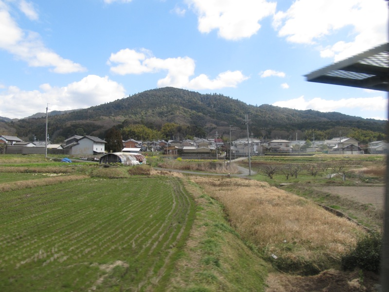 万葉まほろば線の車窓から見る山すその風景。まさにその、すそ野の道を、明日、桜井駅から天理駅まで歩くのです。