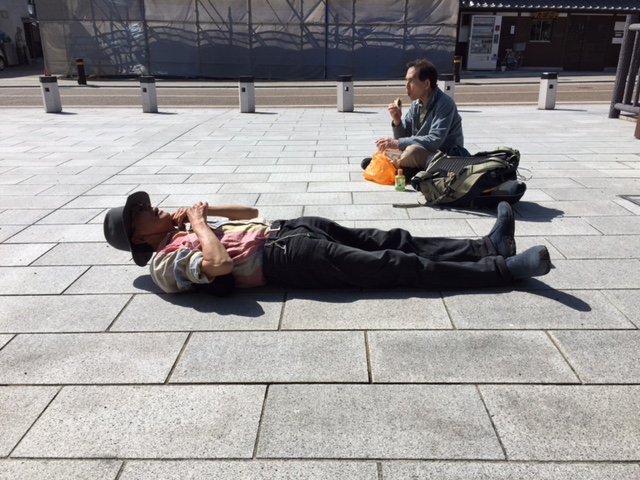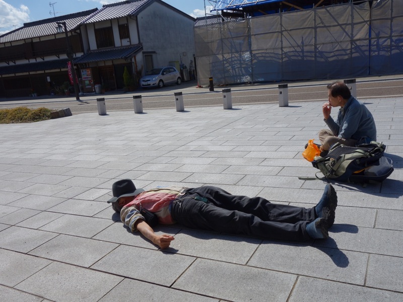 広場の中央に歩いてくる人影がひとつあります。その、広場を横切る道らしき模様の端に立っている女性がいます。向こうからこちらへ伸びてくる低い塀のようなものと重なっていますが、なにか仕事でそこに立っているように見えます。オリジナル写真を拡大して見ると、手に文字の書かれた旗を持っています。お客さんを待っているようです。翌日の午後4時半、私たちが山辺の道から天理へと歩いてこの広場にたどり着くと、やはりここにこの人か、あるいはこの人と同じような雰囲気の人が立っていました。