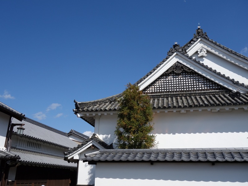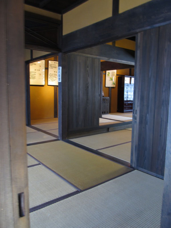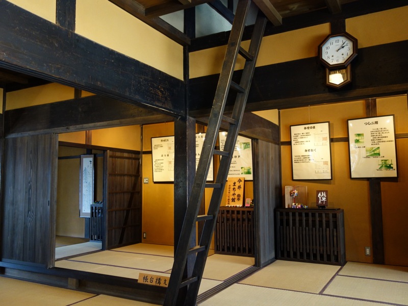 無料の「今井まちや館」に入りました。江戸時代、西暦1700年頃の建築手法をよく残した大型町屋の一般的な建物として復元工事が行われたそうです。建坪約30坪、「2列6室型」とか。