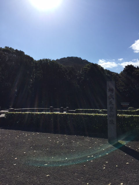 神武天皇陵の一部が写っているのか心許ない。後光がさしてるから大丈夫?