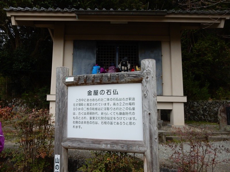 山の辺の道を歩き始めて 暫くすると現れた金屋の石仏。格子越しに拝観することが出来た。