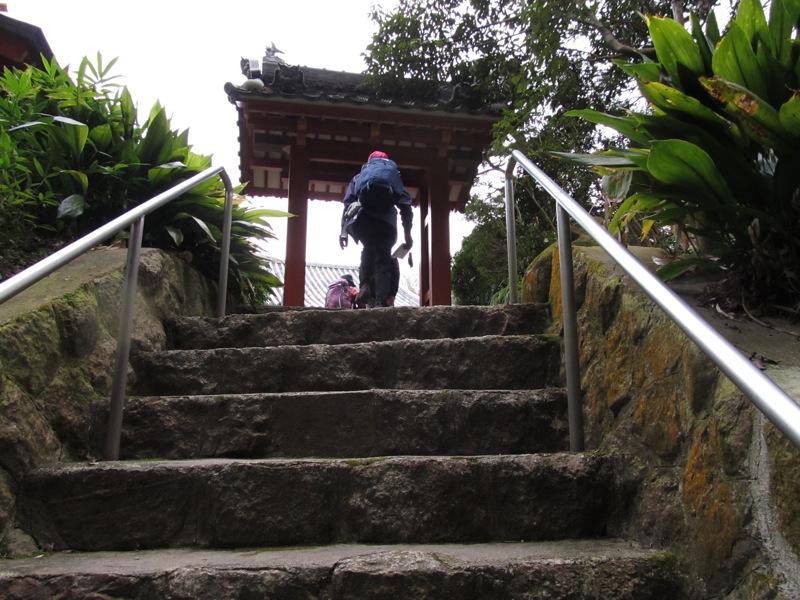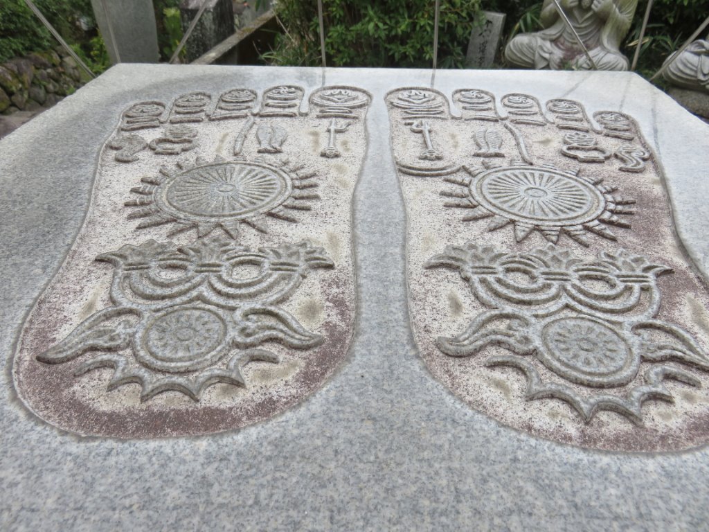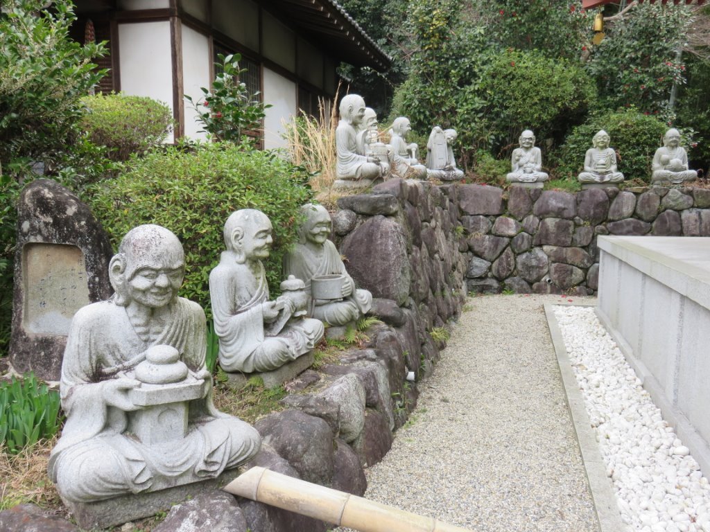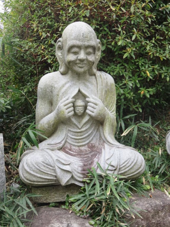 念仏寺だったと思います。なにを意味する石像かわかりませんでしたが、振り向くと山門の内側で若いお坊さん? が庭掃除をしていました。