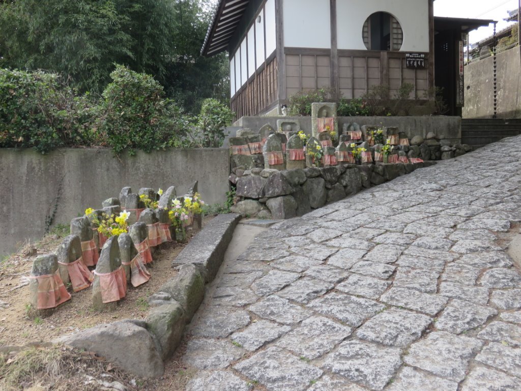 石畳を登っていくと 沢山のお地蔵さんが待っていた。ここでは ごく自然に道の脇に置かれている。