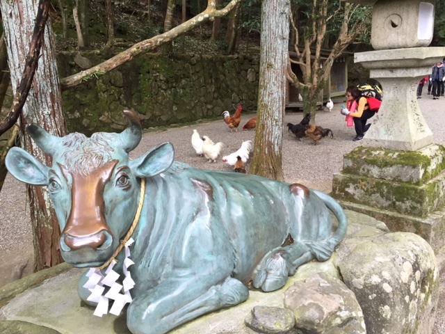 終点、石上神社。なぜかツヤツヤ立派な鶏と牛。