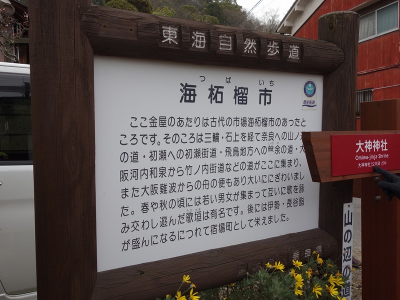 「海石榴市(つばいち)」は「つばきち」「つばきいち」と読んでもかまわないらしいが、フリ仮名がなければちょっと読めない。この案内板は「海石榴市」の簡潔過ぎるほど簡潔な説明であると同時に、東海自然歩道と山の辺の道の標識でもあるという重責を果たしている。こんなそっけない案内板から、古代の多くの地方からの道が集まるこの地は、厳しい冬の季節が終わるころには、柔らかな春の日差しの中で若い男女のおおらかな集いが営まれた、ということを想像するのはちょっと難しい。