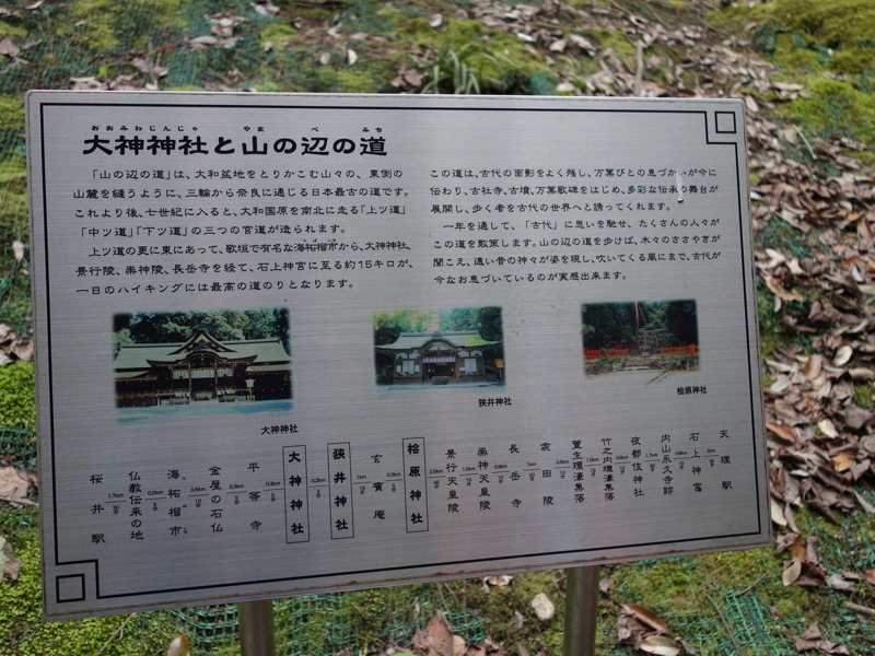午前8時20分に桜井駅から歩き出してすでに6時間。天理市と桜井市が窓口となっている「山の辺の道美化促進協議会」のガイド地図には全行程約16kmの途中距離が記されているのですが、それを見るとこのトイレ休憩地は桜井駅から約8km、天理駅まで約8km。ちょうど中間距離でした。三輪山の登山を外すと4時間。時速約2kmは縦走登山の快適な尾根道のスピードです。