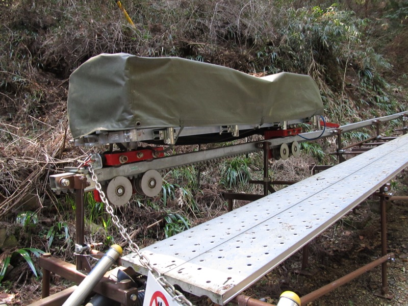 でもこのモノレール、ミカン畑や植林地でよく見かけます。今年1月の京都ハイキングでは鞍馬山でのロープウェイ工事のために敷設された工事用モノレールがカッコいいもので、乗りたいと思わせられました。また鹿沼の古賀志山ではパラグライダー学校が設置した人員輸送用モノレールを見ています。富士山麓の杓子山のパラグライダーゲレンデにも設置されていたと思います。このモノレールがもっと自由に乗客を乗せて運行できるようになると、山国日本の観光地は大きく変わると思うのですが、私が目にしたその最初のケースです。