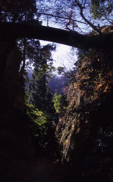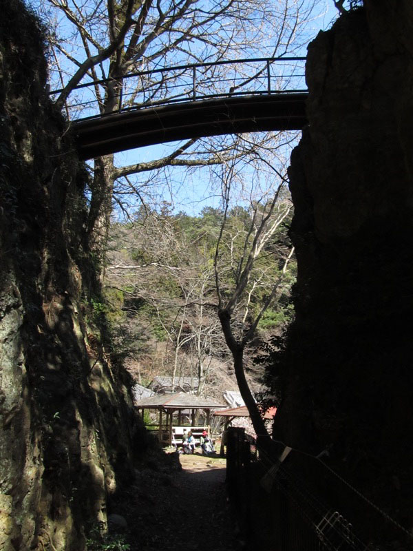 この橋には天高橋(てんこうきょう)という名前がついています。葛飾北斎の「足利行道山くものかけはし」という浮世絵があるそうですが、見てみると現在の風景と同じです。これは裏側から見ているので、右側の岩が尖った大岩でその上に清心亭が建てられていて、そこに渡る唯一の道としてこの橋が架けられているというかたちになります。