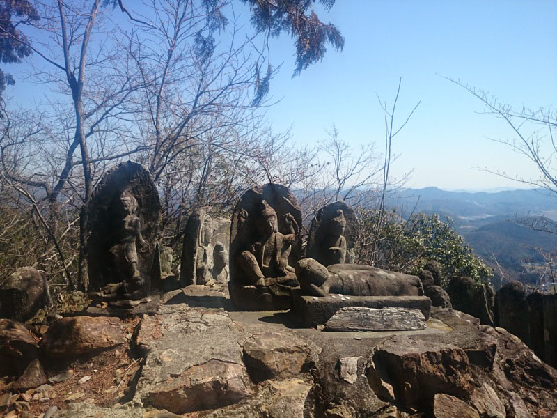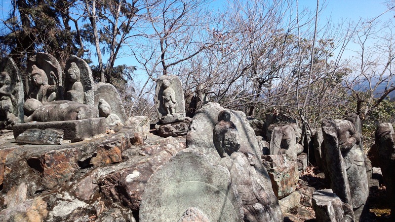 *この日は1050浄因寺駐車場(標高約250m)を出発→1100-10浄因寺で休憩(標高約300m)→1140-50石尊山見晴台(標高442m)→1220-25大岩山(標高417m)→1240-50毘沙門天でトイレ休憩(標高約350m)→1355-1405両崖山山頂(標高251m)→1450-1525織姫公園ハーブレストラン(標高約100m)でお茶→1535織姫神社(標高約100m)